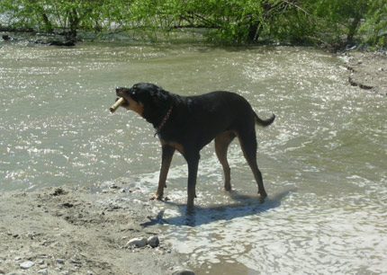Back up the hill and down the next trail. Finally, we were nearing water! And were the pups ever glad! They were panting like crazy. But soon enough they were in the water, chasing sticks, chasing each other and having a good frolic!